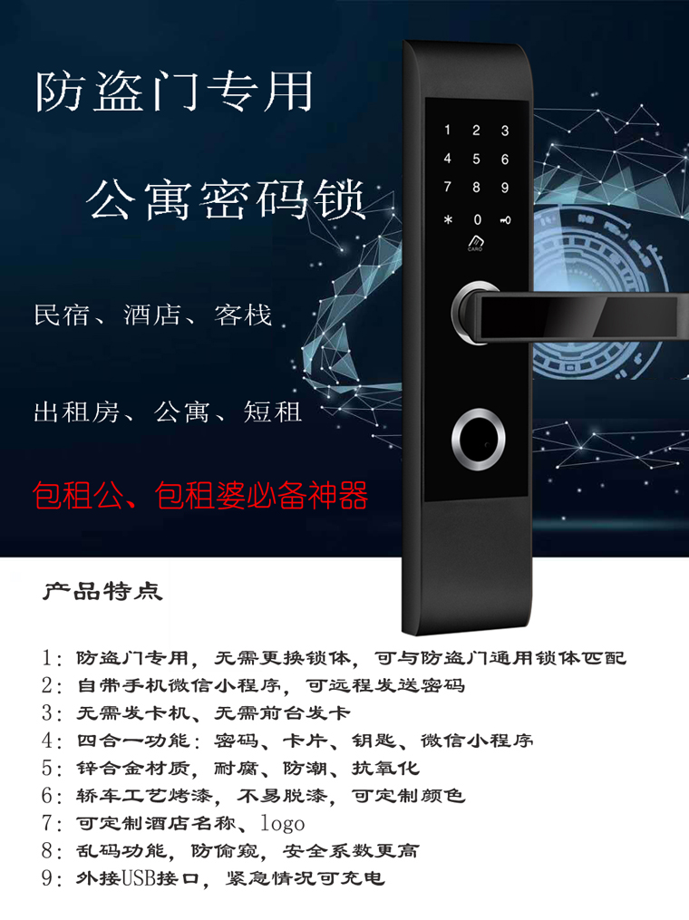 开门方式:密码开门/钥匙开门/卡片开门